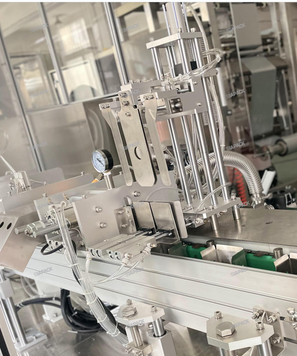 Mesin iki desain khusus kanggo nggawe tas gusset karo label ndhuwur .Sawise tas lengkap karo produk drop ing mesin iki .Mesin iki bakal nggawa tas, liwat siji wektu tas tutuk lempitan lan banjur nempel label.The pigura mesin digawe dening SUS304 .PLC lan layar tutul nganggo merek Siemens .Lan bagean Pneumatik nganggo merek SMC .Komponen Listrik Utama nganggo merek Omron lan Schneider.Mesin iki nggarap mesin kemasan otomatis kanggo nggayuh label ndhuwur tas rampung .Mesin iki bisa kanthi otomatis nggayuh fungsi kasebut saka label dipisahake , Label ngirim .Label detector lan label mencet .